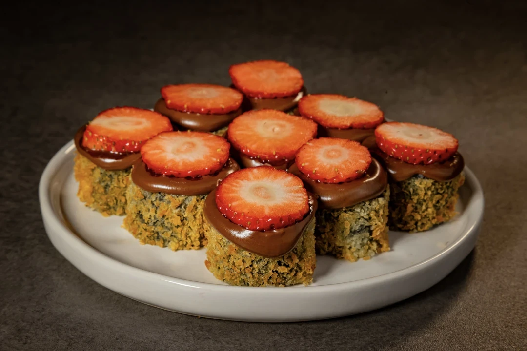 Roll de arroz e morango envolto por alga nori, frito, finalizado com chocolate branco e morango.