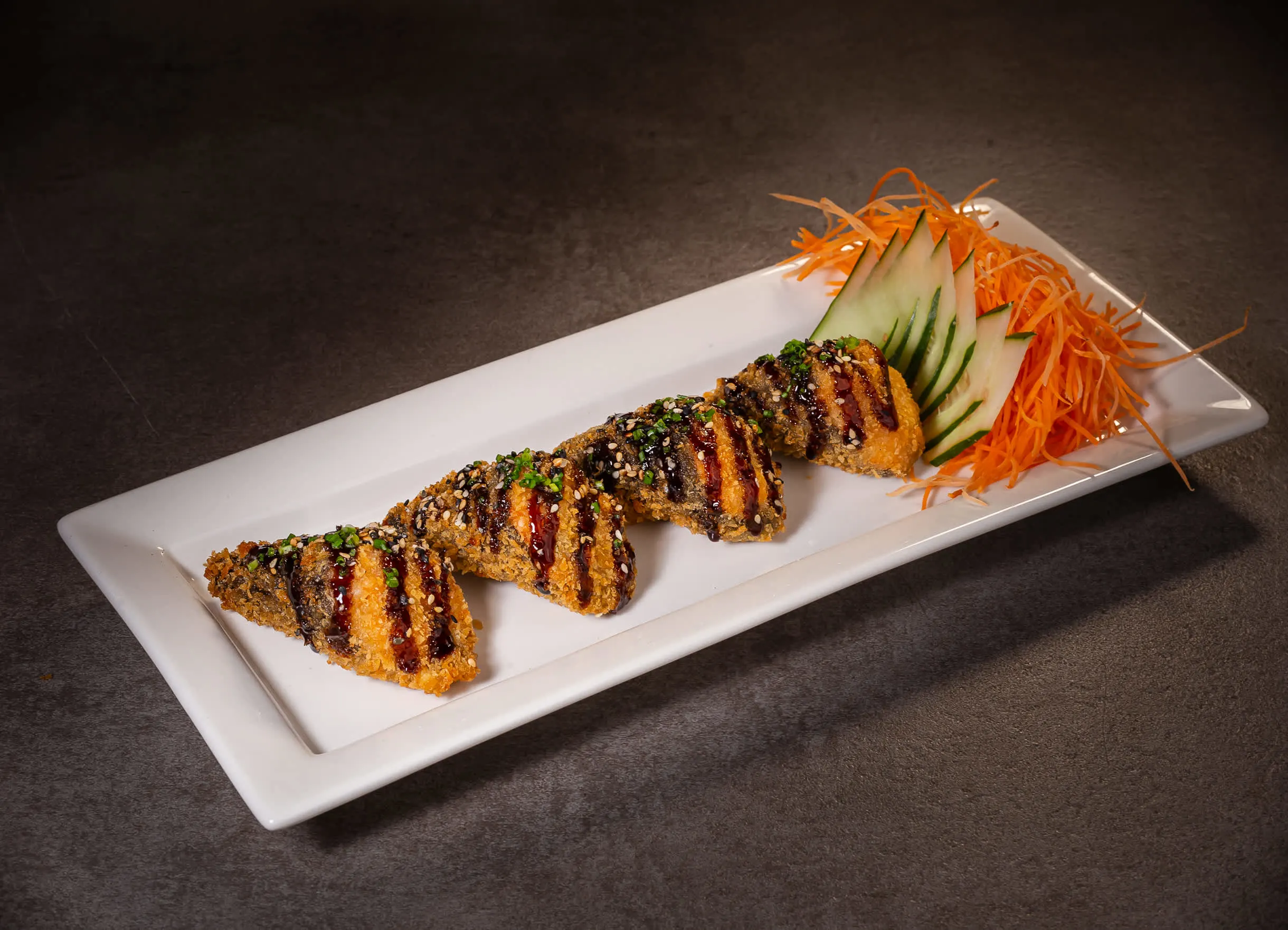 04 cones fritos de alga nori, recheados com arroz, salmão, cream cheese Philadelphia e cebolinha. **contém lactose** **contém glúten**